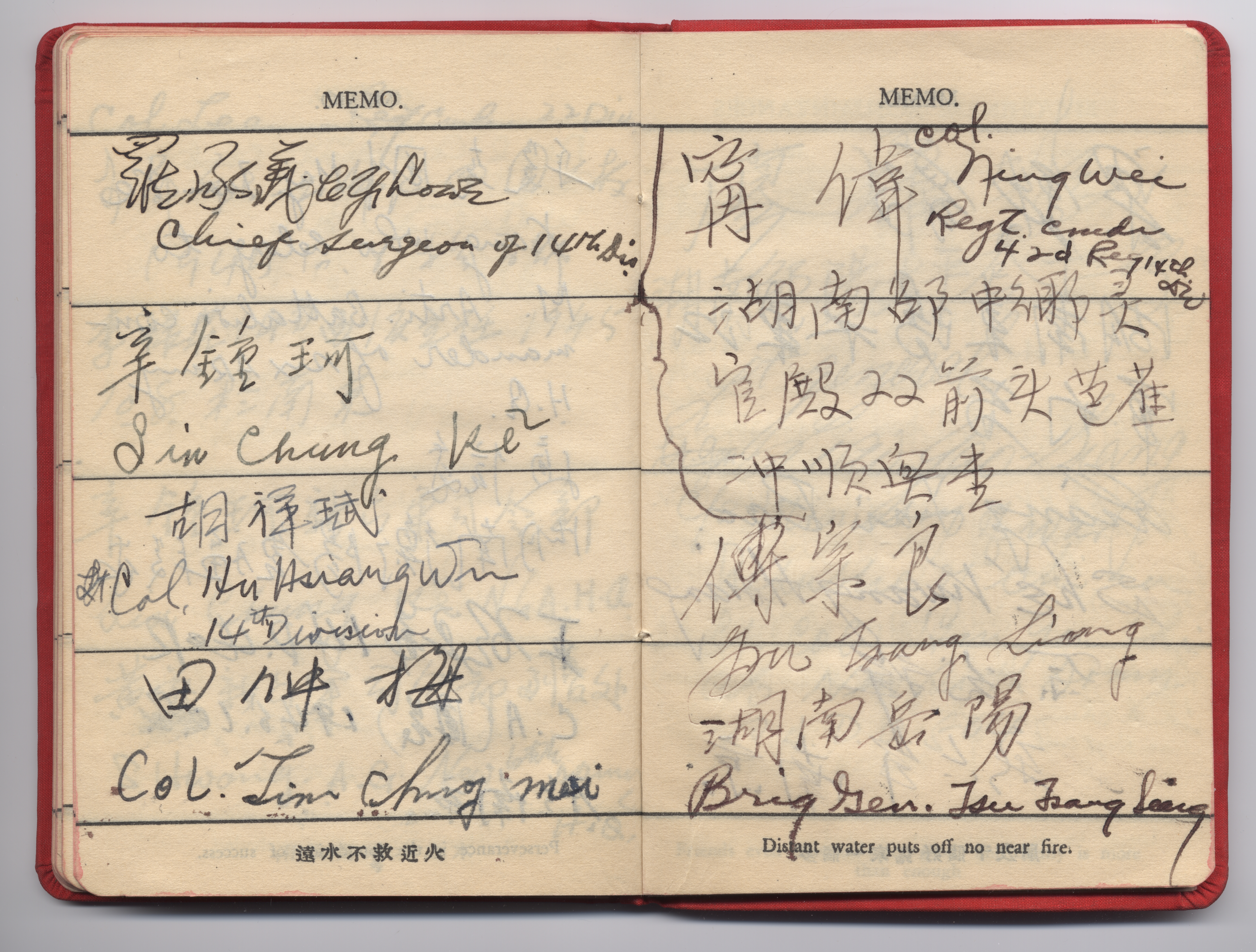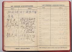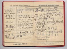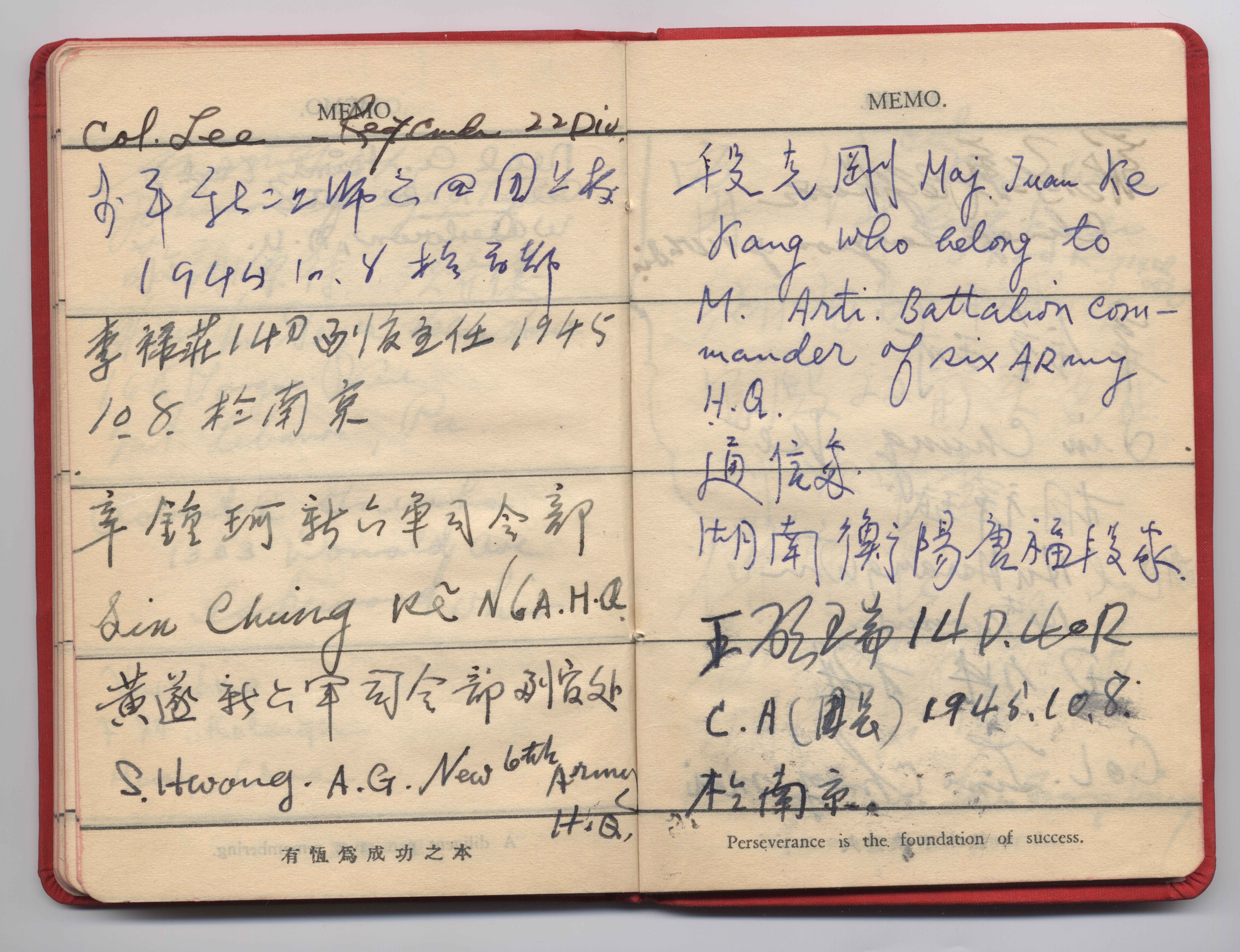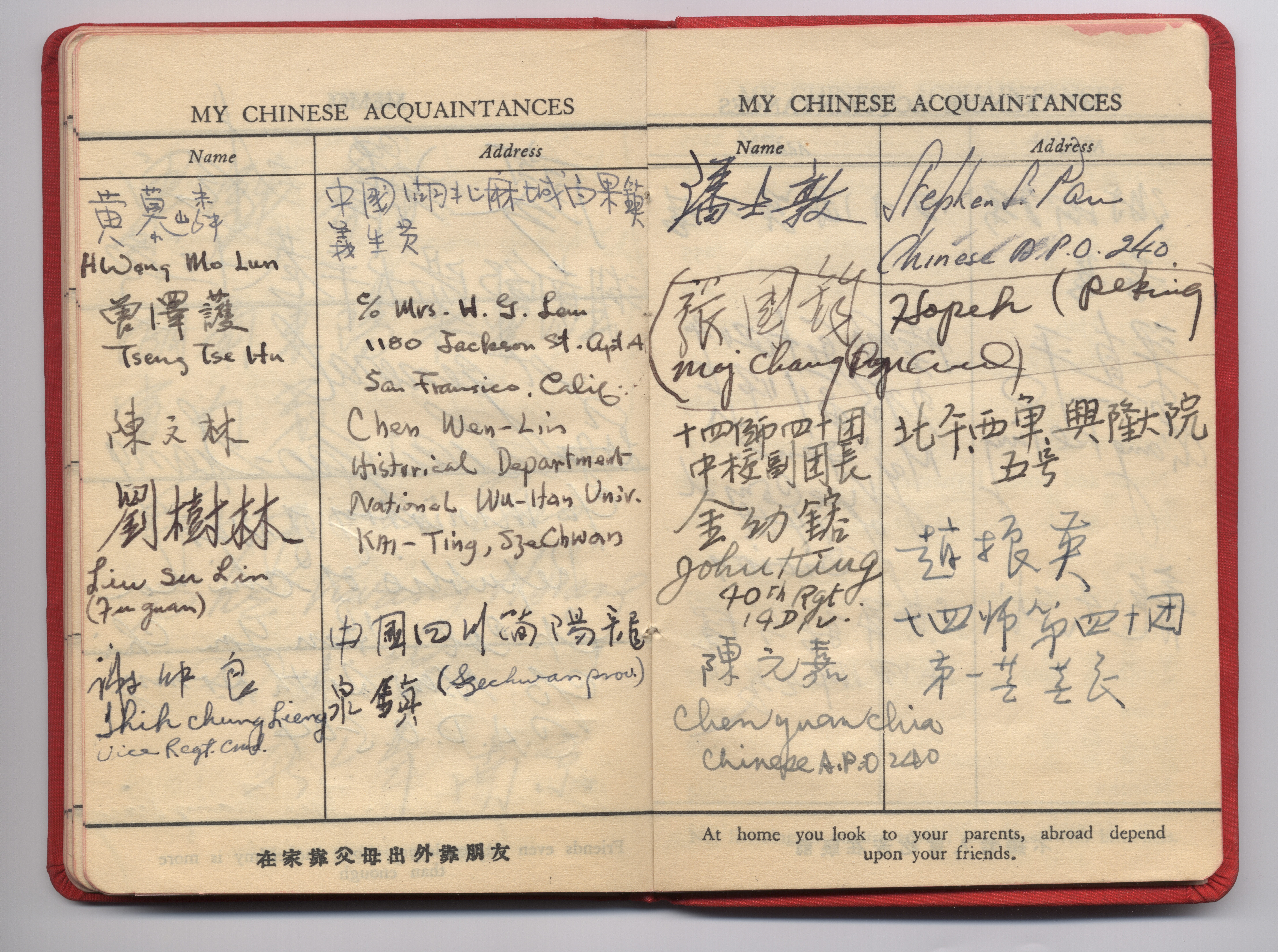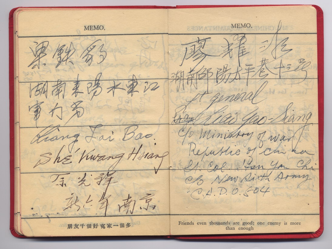 Page one from Maj. Gardner's War Area Service Corps (WASC) Diary for 1945 containing autographs and addresses of Chinese Commanders and other friends he served with in the CBI. This page contains the autograph of Lt. General Liao Yao-shiang, Commander of the New Sixth Army which included the 14th, 22d,and 50th Divisions.