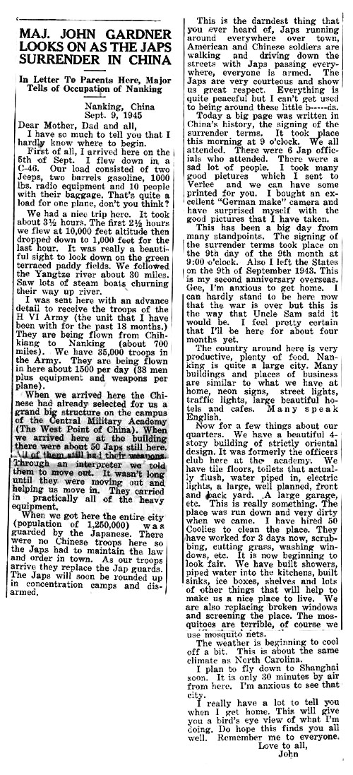 Actual clipping of a letter from Maj. Gardner to his parents in Mooreland, Oklahoma. The text of the letter has been transcribed and can be found here.