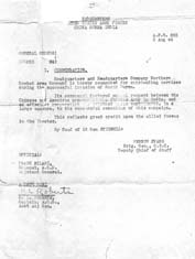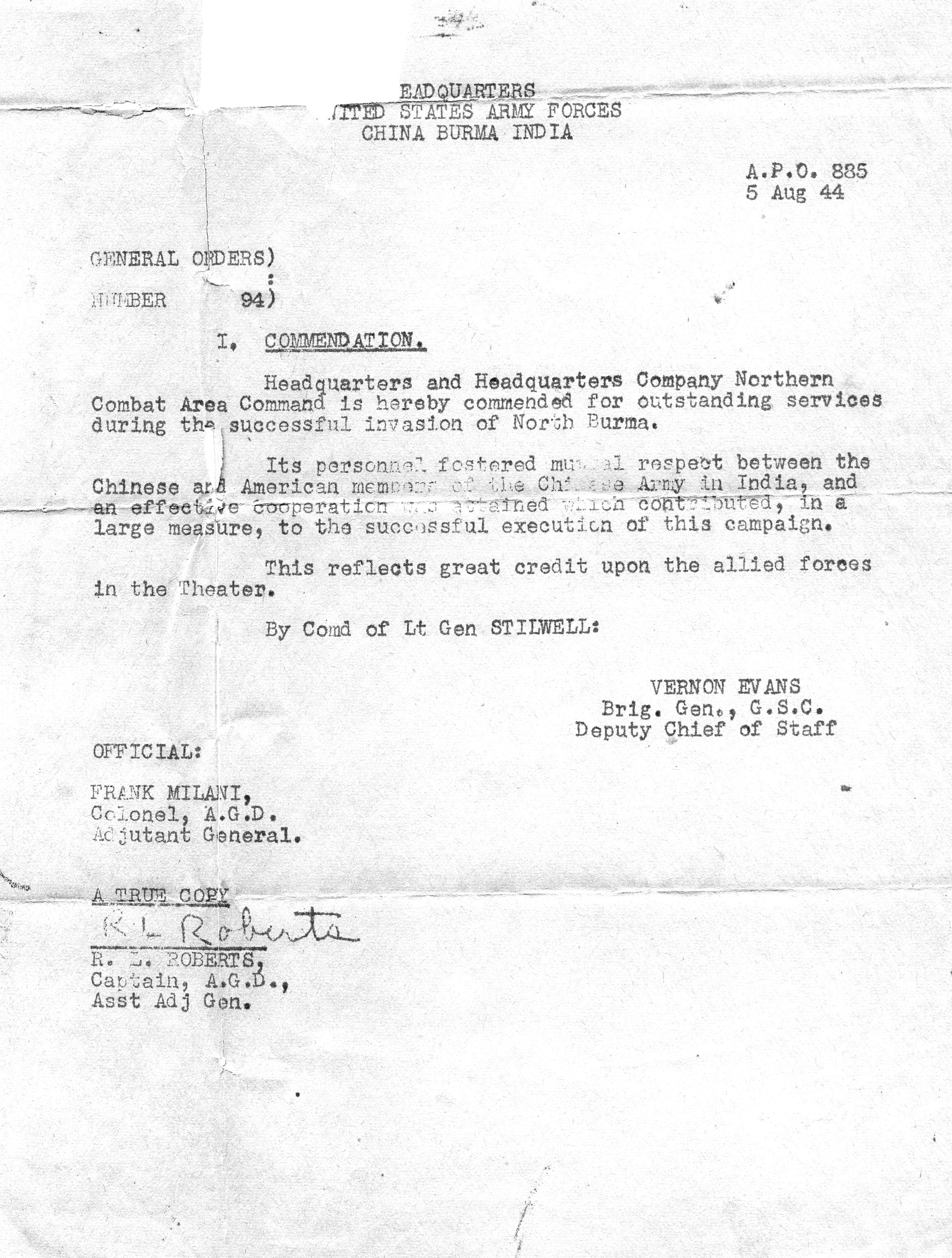 Commendation received from Lt. General Stilwell for outstanding services during the successful invasion of Northern Burma. This led to a Presidential Unit Citation for the Headquarters NCAC.