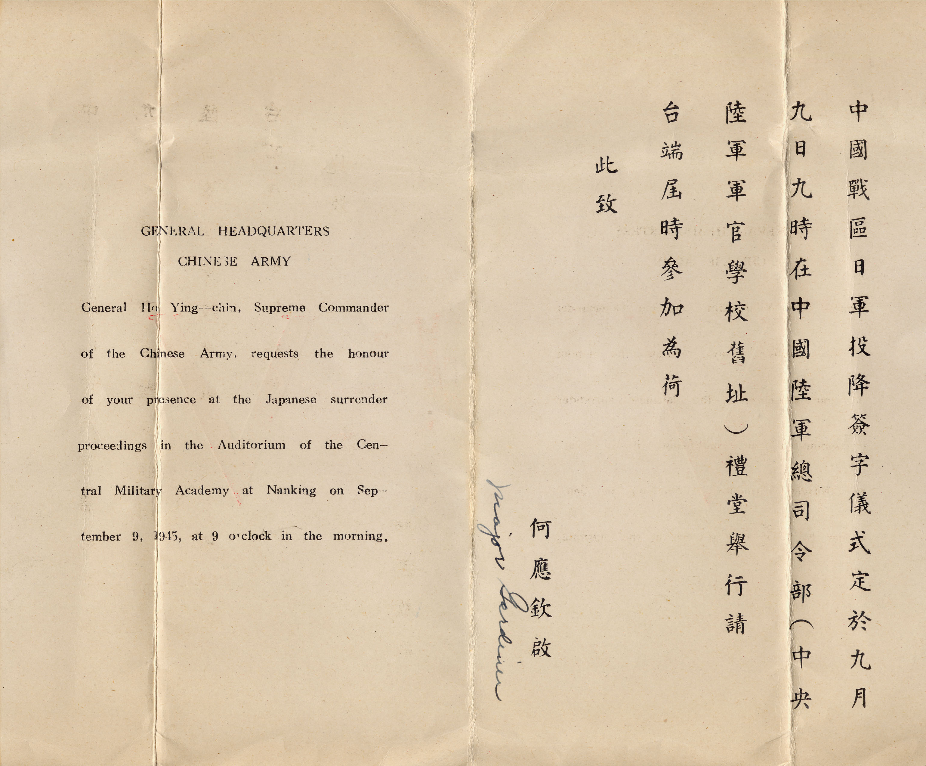 Photograph taken after the Japanese Surrender Proceedings. A translation of the writing at the top of the photo has been provided by Patrick Lucas: Literal: "Army newly reorganized 6th army officer's club opening ceremony keepsake (34 year of the Republic, 10th month, 6th day in Nanjing)"