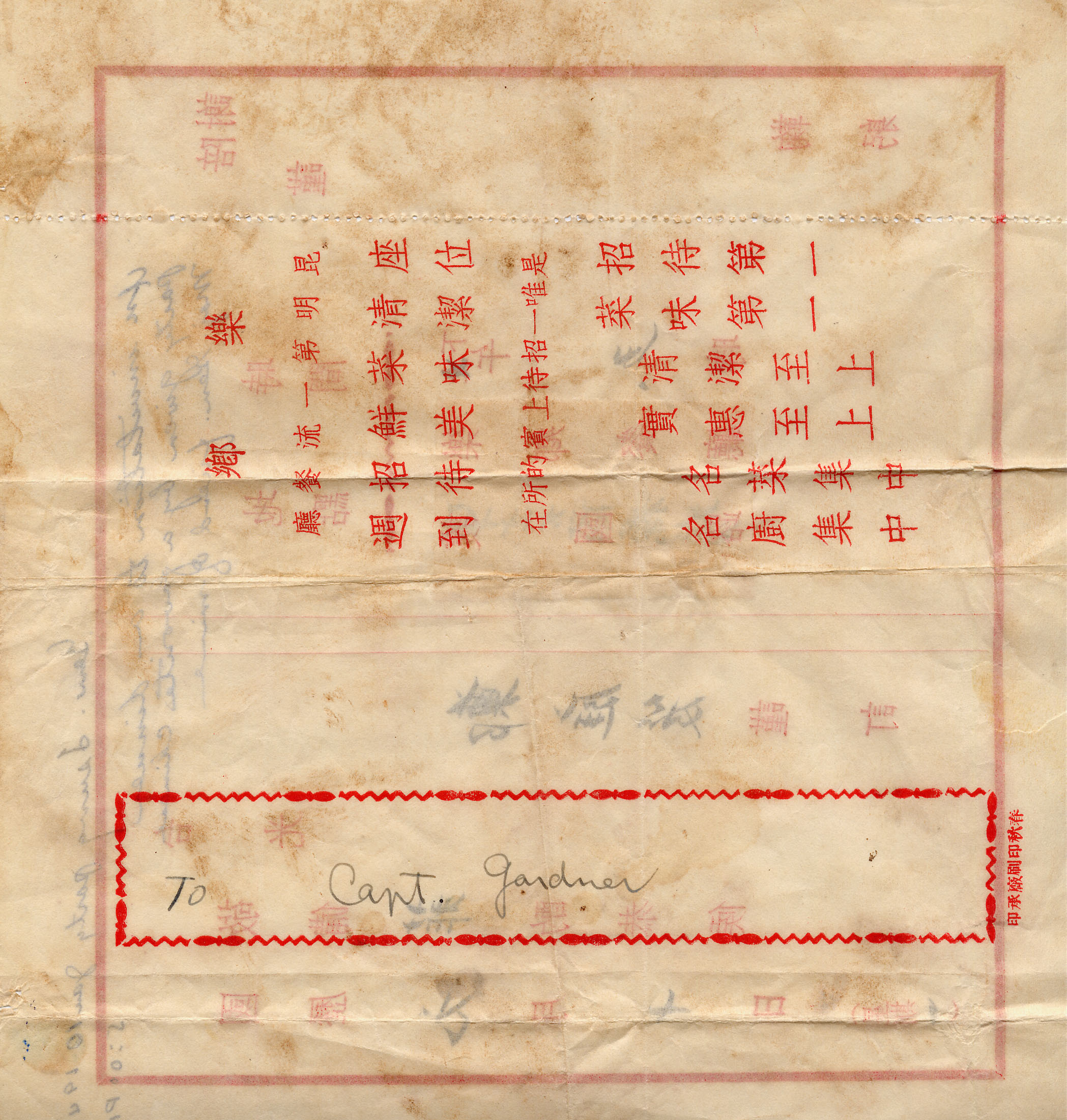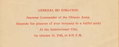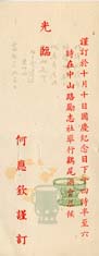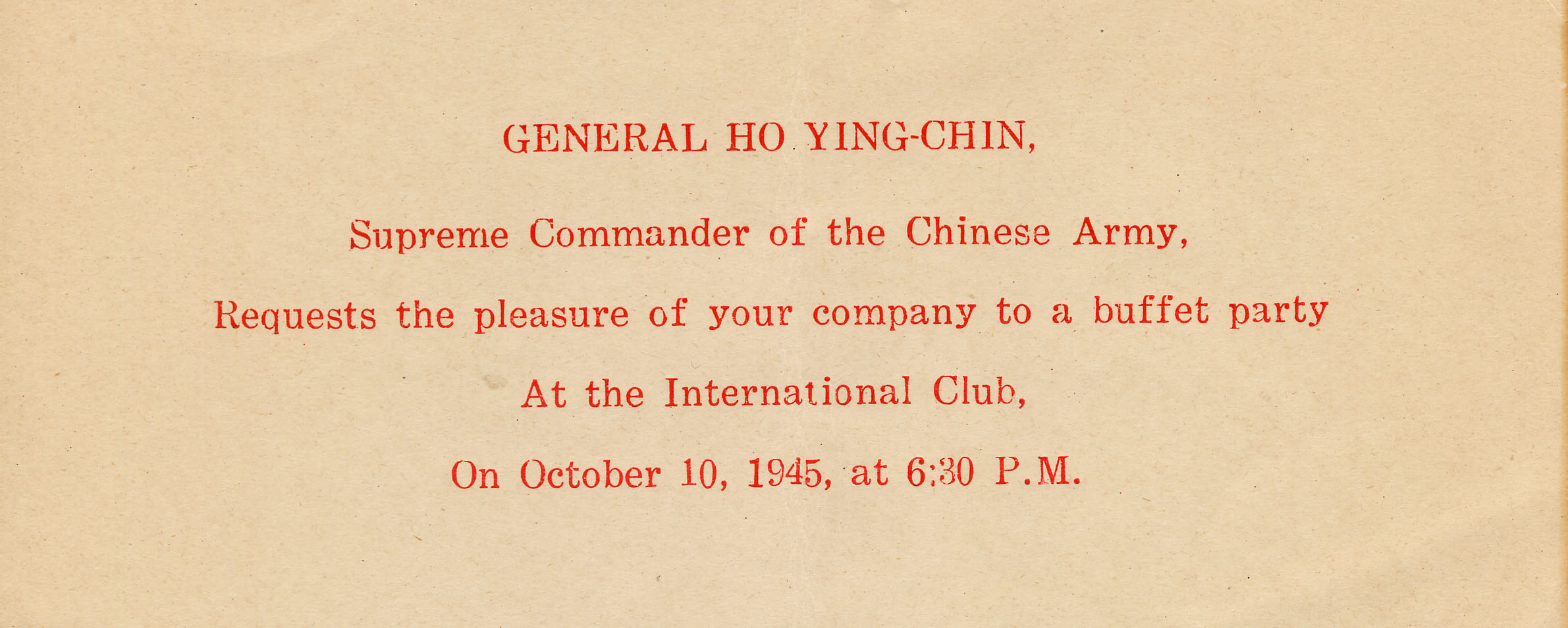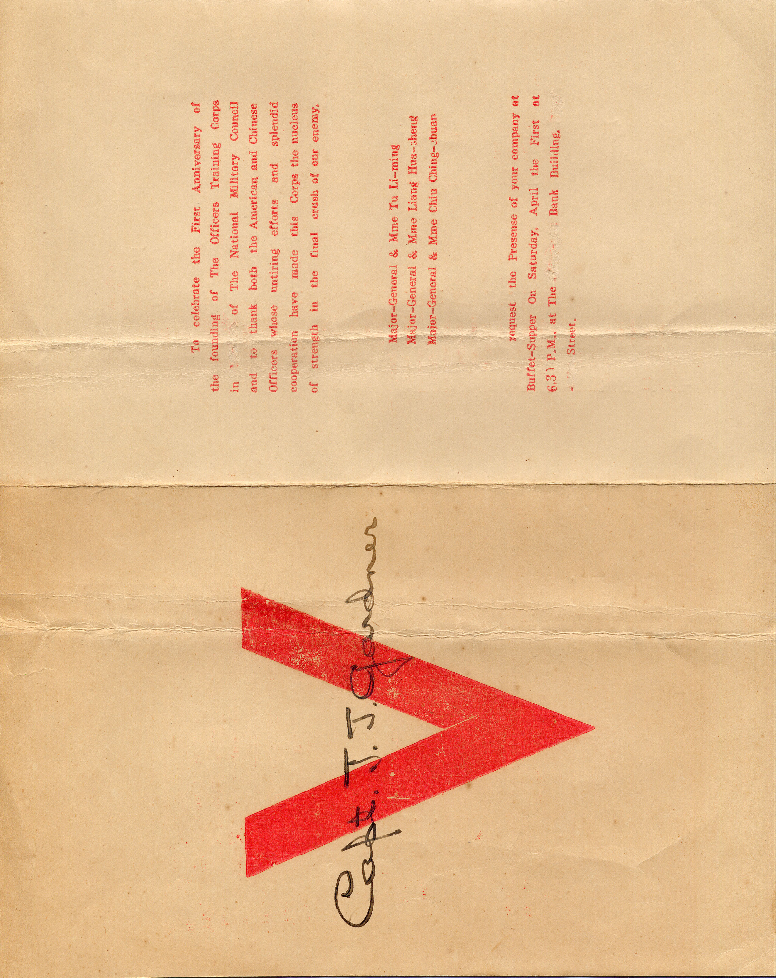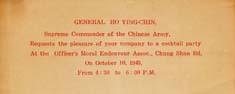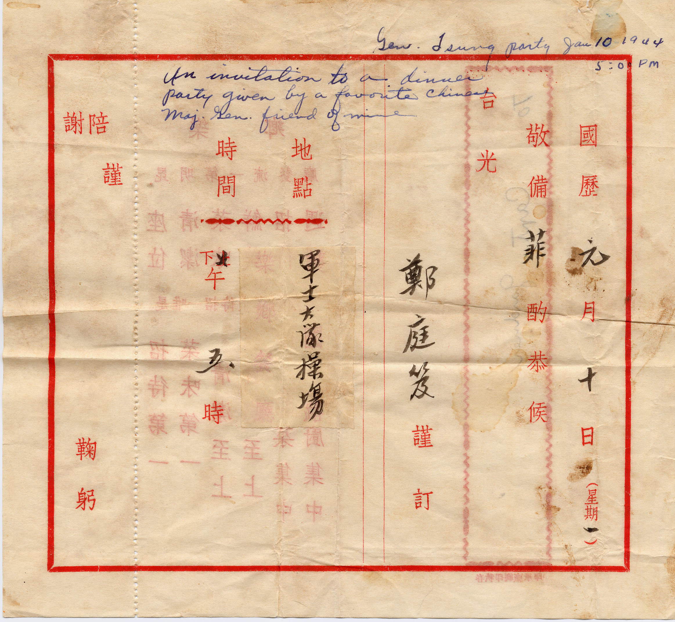 Written on invitation: "An invitation to a dinner party given by a favorite Chinese Major General friend of mine".