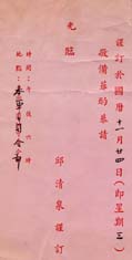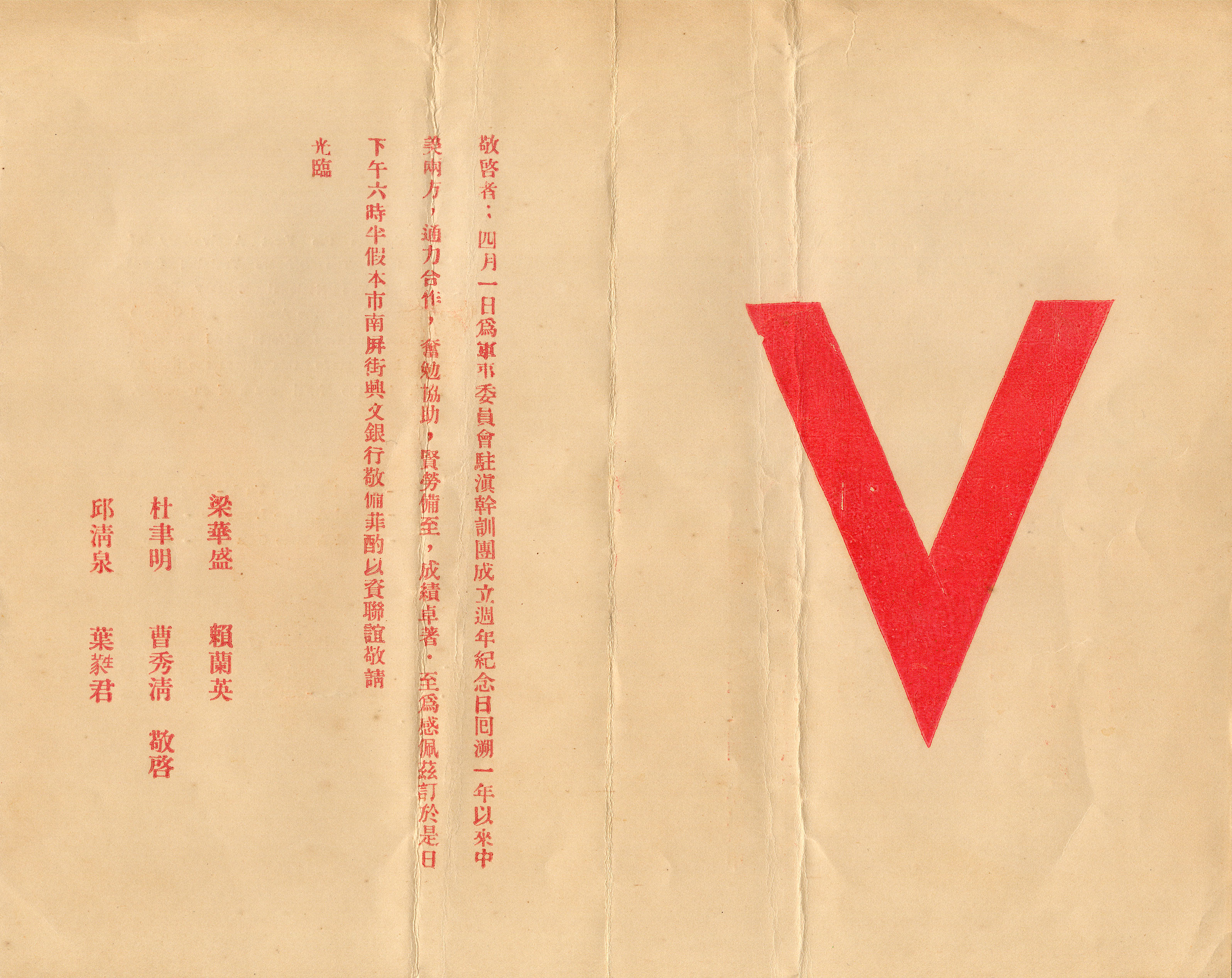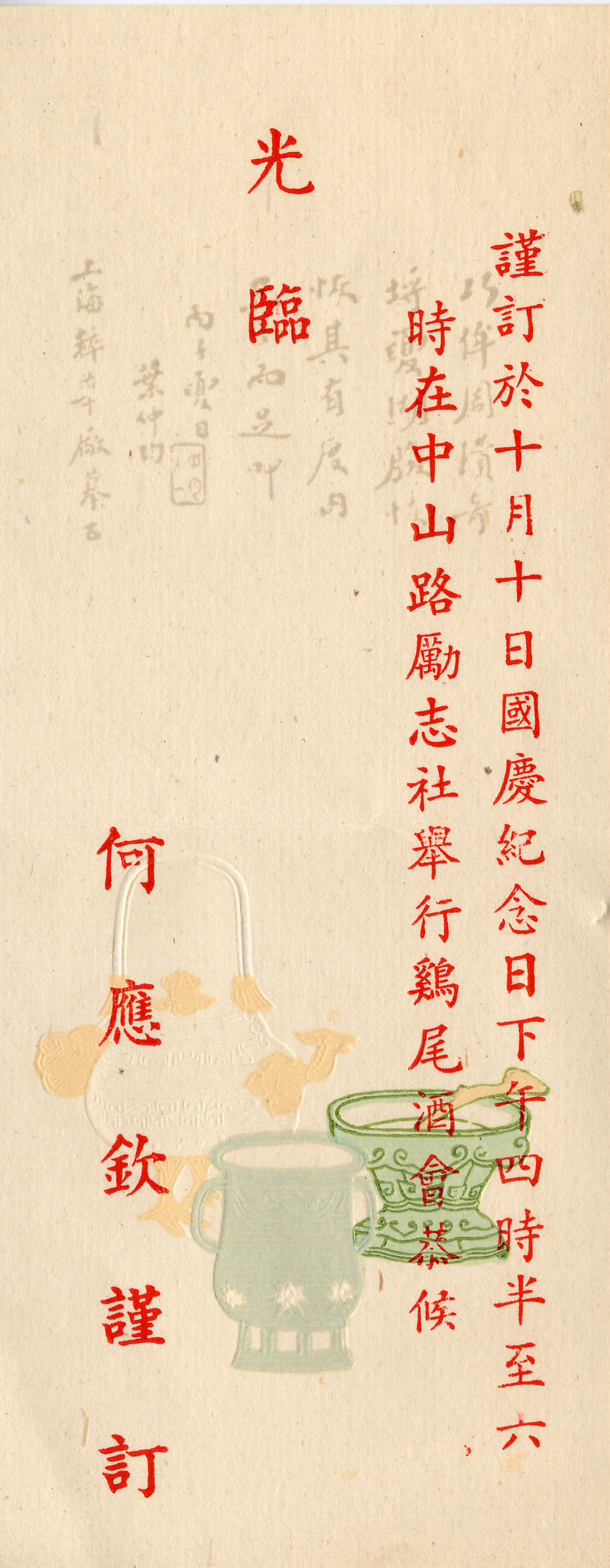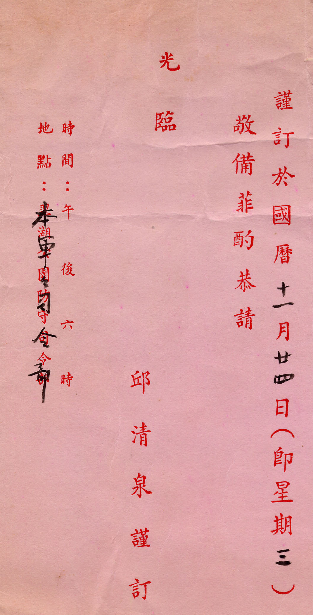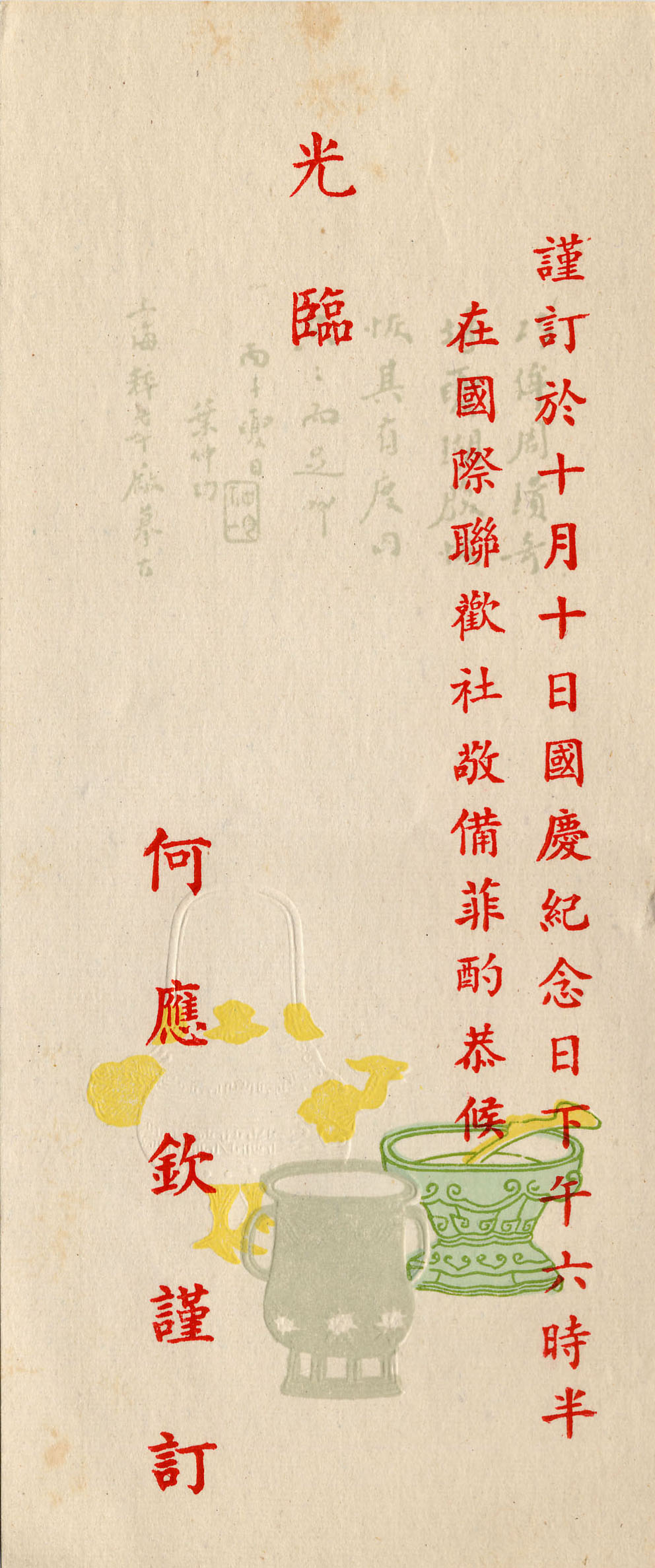 Written on invitation: "An invitation to a dinner party given by a favorite Chinese Major General friend of mine".