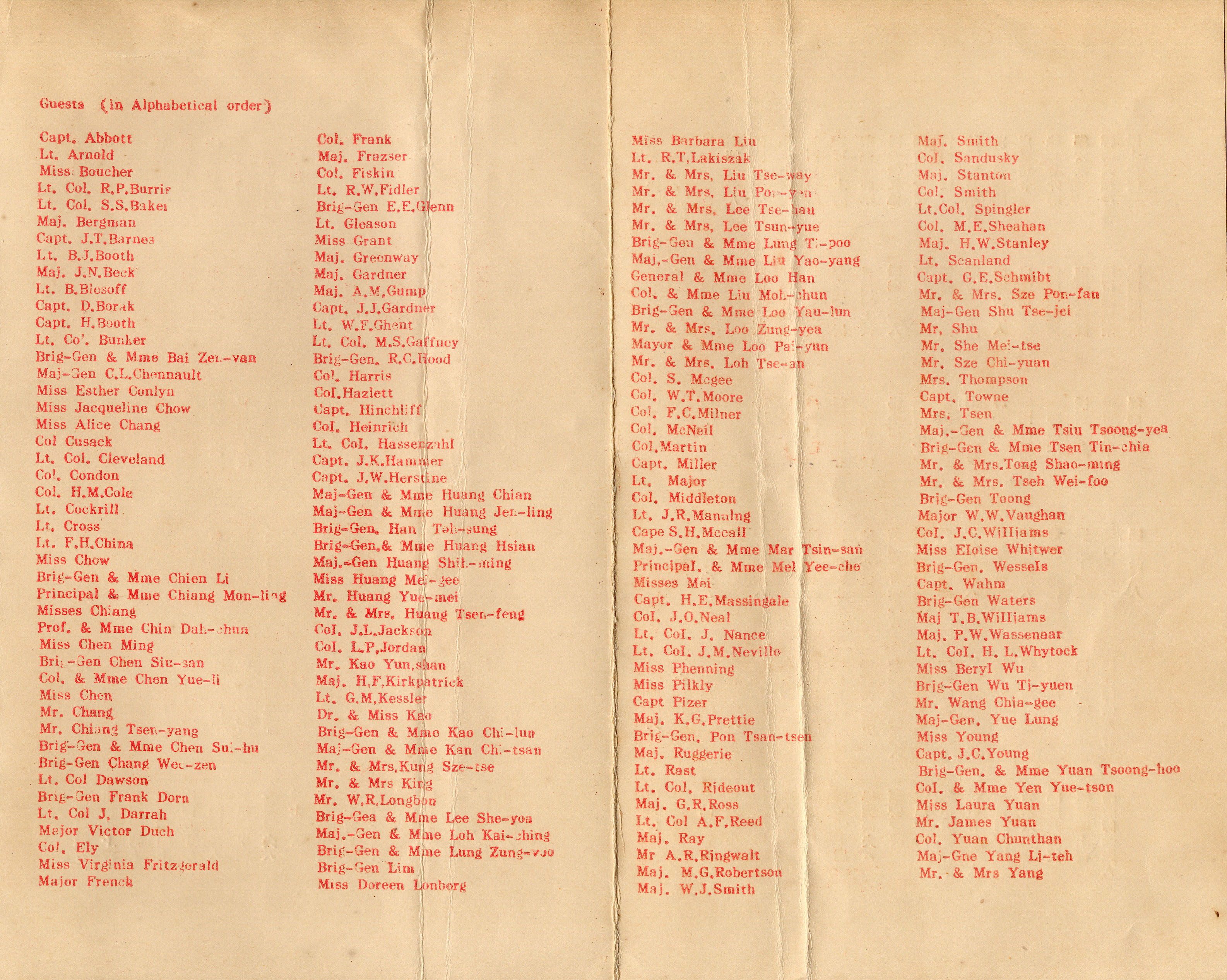 Several well known officers listed as attendees, (Maj. Gen. C. L. Chennault, Brig. Gen. Frank Dorn, Brig. Gen. Wessels, along with numerous other dignitaries.)
