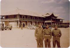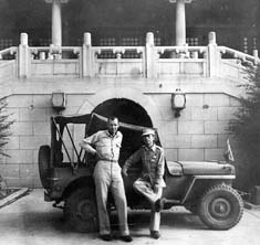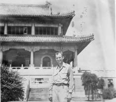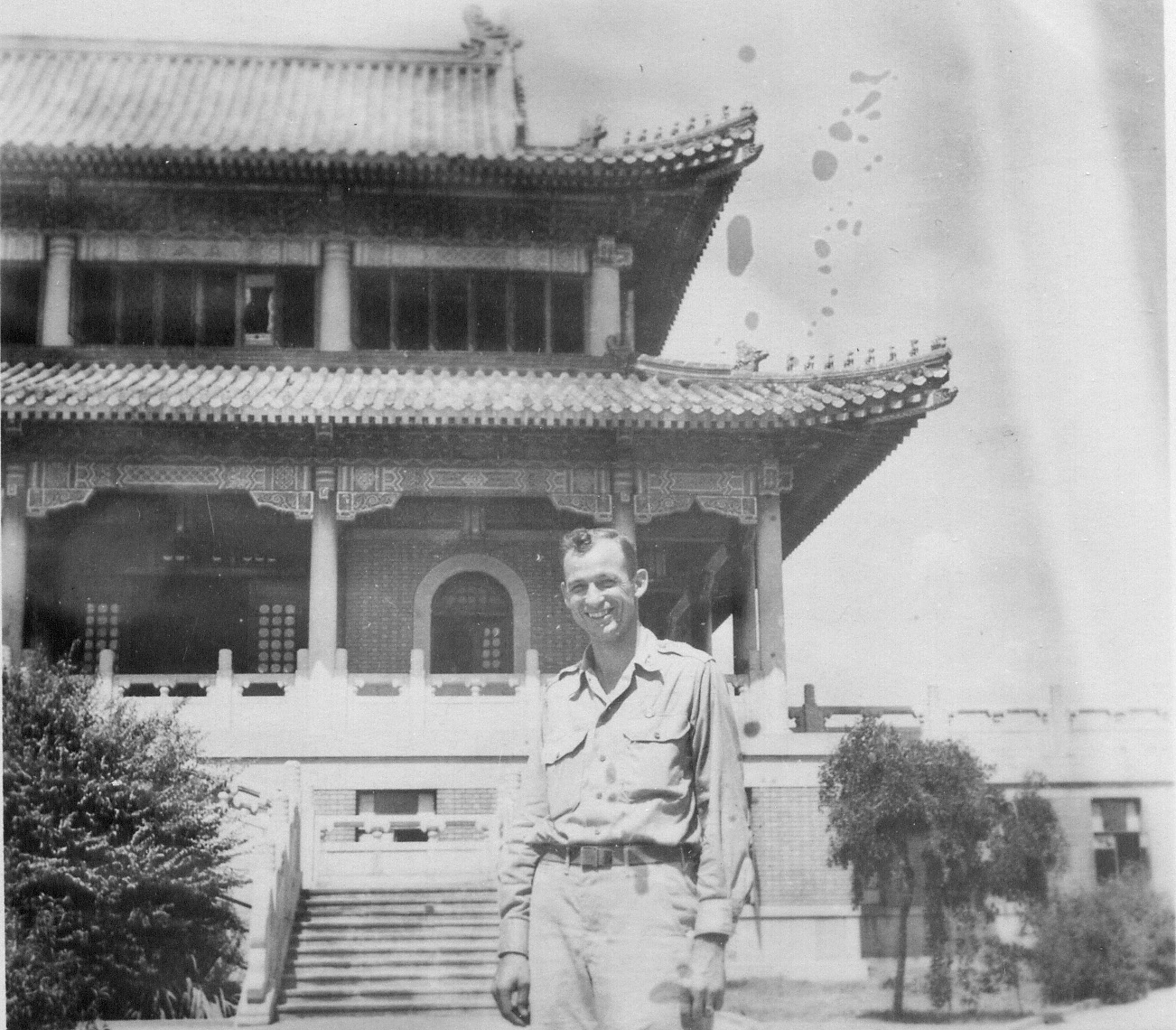 Maj. Gardner standing in front of the Sun Yat-Sen Library in Nanking where American Liaison Officers of the Chinese Combat Command took up residence during preparation for the Japanese Surrender.