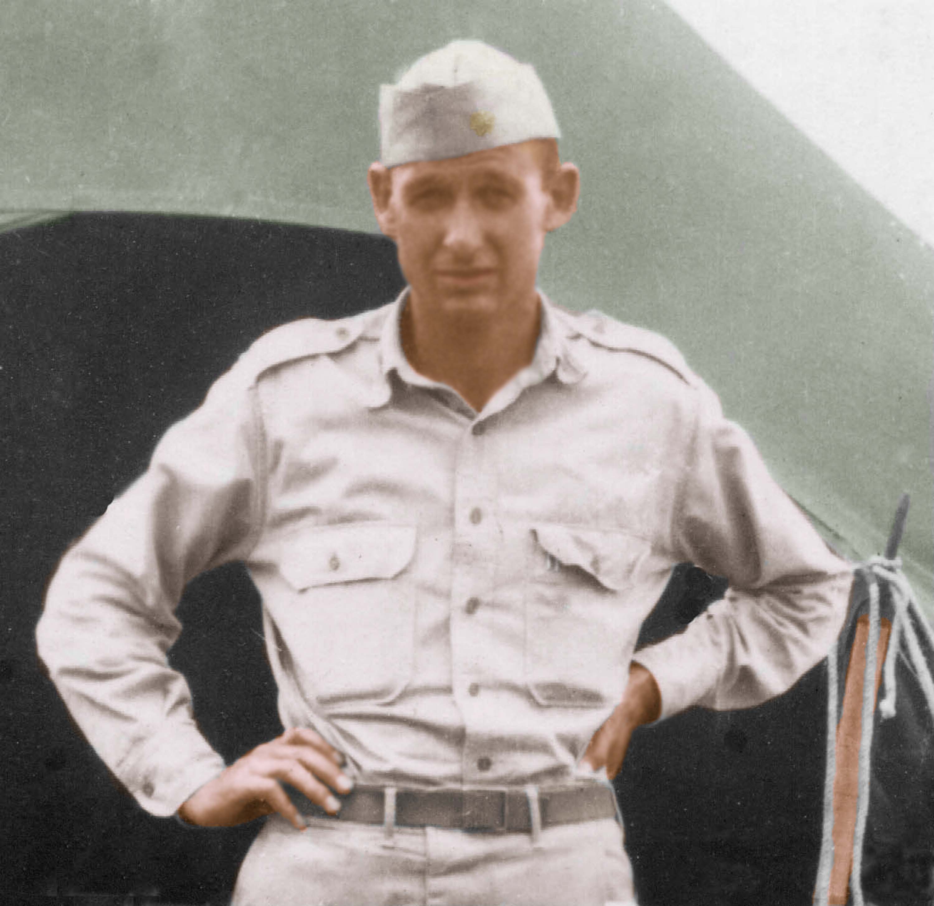 Another colorized photograph of Maj. Gardner standing outside his tent in either Burma or India.