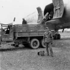 Maj. Gardner preparing to board a C-54 transport, destination unknown.