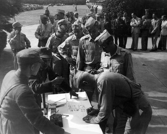 Allied Forces signing a register of attendance at the Surrender Proceedings in Nanking, China (Sept 9, 1945).