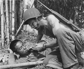 This photograph was acquired by S. Neal Gardner through an auction. It is "Real Photo - Not Modern Reproduction" This is a 1st generation photo manufactured around the time when the image was created. Most often from the original negative but not always. News Agency photos fall into this category. The caption reads "Yank gives light to wounded Chinese". Northern Burma ... P.F.C.Ralph G. Smith of Morristown, N.J. lights a cigarette for a wounded Chinese comrade during the fighting in the Hukawng valley when General Stilwell's American and U.S.-Trained Chinese forces succeeded in driving the Japs out of North Burma, inflicting heavy losses upon the enemy.