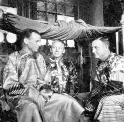A photograph of Major Gardner (left) wearing a Chinese robe sitting with two other Liaison Officers.
